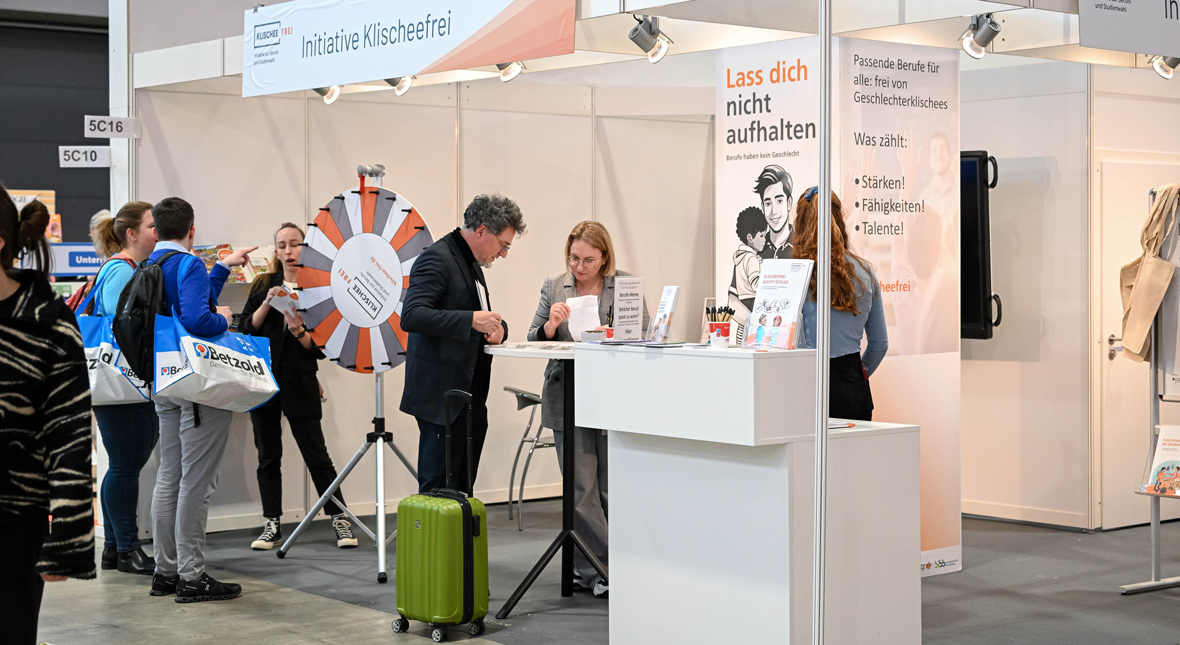 In der sehr gut besuchten Halle 5 auf dem Messegelände in Stuttgart, die sich auf schulische und außerschulische Bildung konzentrierte, gab es am Stand der Initiative Klischeefrei von 9 bis 18 Uhr einen regen Austausch. Rund 2.000 Besucherinnen und Besucher interessierten sich an fünf Messetagen für die Angebote für pädagogische Fachkräfte.