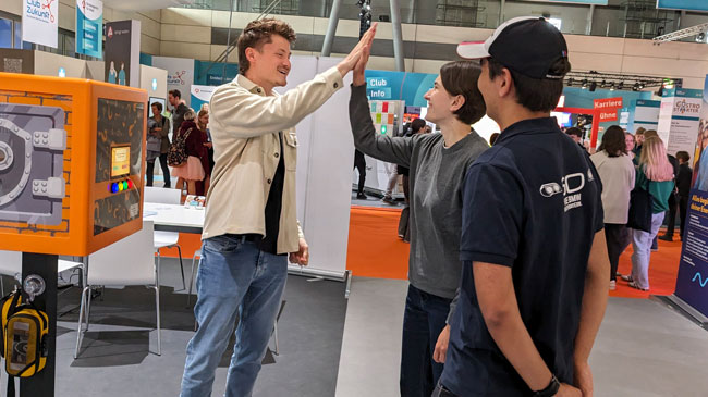 Hohen Besuch gab es am Stand der Initiative Klischeefrei auf der IdeenExpo 24: Jugendministerin Lisa Paus und Dr. Jens Brandenburg, Parlamentarischer Staatssekretär bei der Bundesministerin für Bildung und Forschung (PStS), probierten die Mitmachangebote wie das Wissensrad oder den ESCUBE aus. Und es gab noch weitere prominente Gäste, vor allem aber eine Überraschung für die vielen interessierten Jugendlichen.