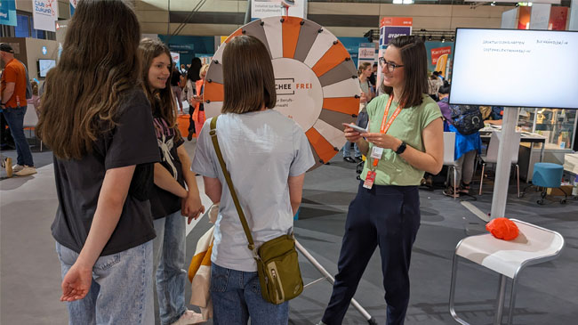 Mal am Klischeefrei-Wissensrad drehen, am Escape-Game ESCUBE zum Thema klischeefreie Berufswahl rätseln oder das Klischeefrei-Quiz ausprobieren: Am Montag, den 10. Juni 2024 besuchten neben zahlreichen Jugendlichen auch Bundesjugendministerin Lisa Paus und Dr. Jens Brandenburg, Parlamentarischer Staatssekretär (PStS) beim Bundesministerin für Bildung und Forschung den Stand der Initiative Klischeefrei auf der Berufsorientierungsmesse IdeenExpo 2024 in Hannover. Miguel Diaz, Leiter der Servicestelle der Initiative Klischeefrei, stellte ihnen die vielfältigen Angebote der Initiative vor. Sowohl Paus als auch Brandenburg machten sich einen persönlichen Eindruck vom Klischeefrei-Wissensrad, vom Rätsel-Würfel ESCUBE und vom Klischeefrei-Quiz.