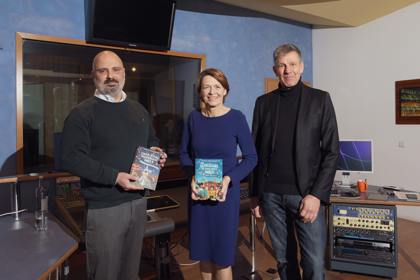 Damit Band 1, „Der Schlüssel zu Oma Edas Welt oder warum Ausprobieren hilft“ für Leseanfängerinnen und Leseanfänger sowie Band 2 „Oma Edas wundersame Welt und der geheimnisvolle Raketenplan“ für fortgeschrittene Leserinnen und Leser, ab sofort noch mehr Kinder erreichen, hat Schirmherrin Elke Büdenbender einen Nachmittag im Tonstudio verbracht. Entstanden sind zwei kurzweilige Hörbücher, die als Audiodateien nun barrierefrei für alle zugänglich sind.