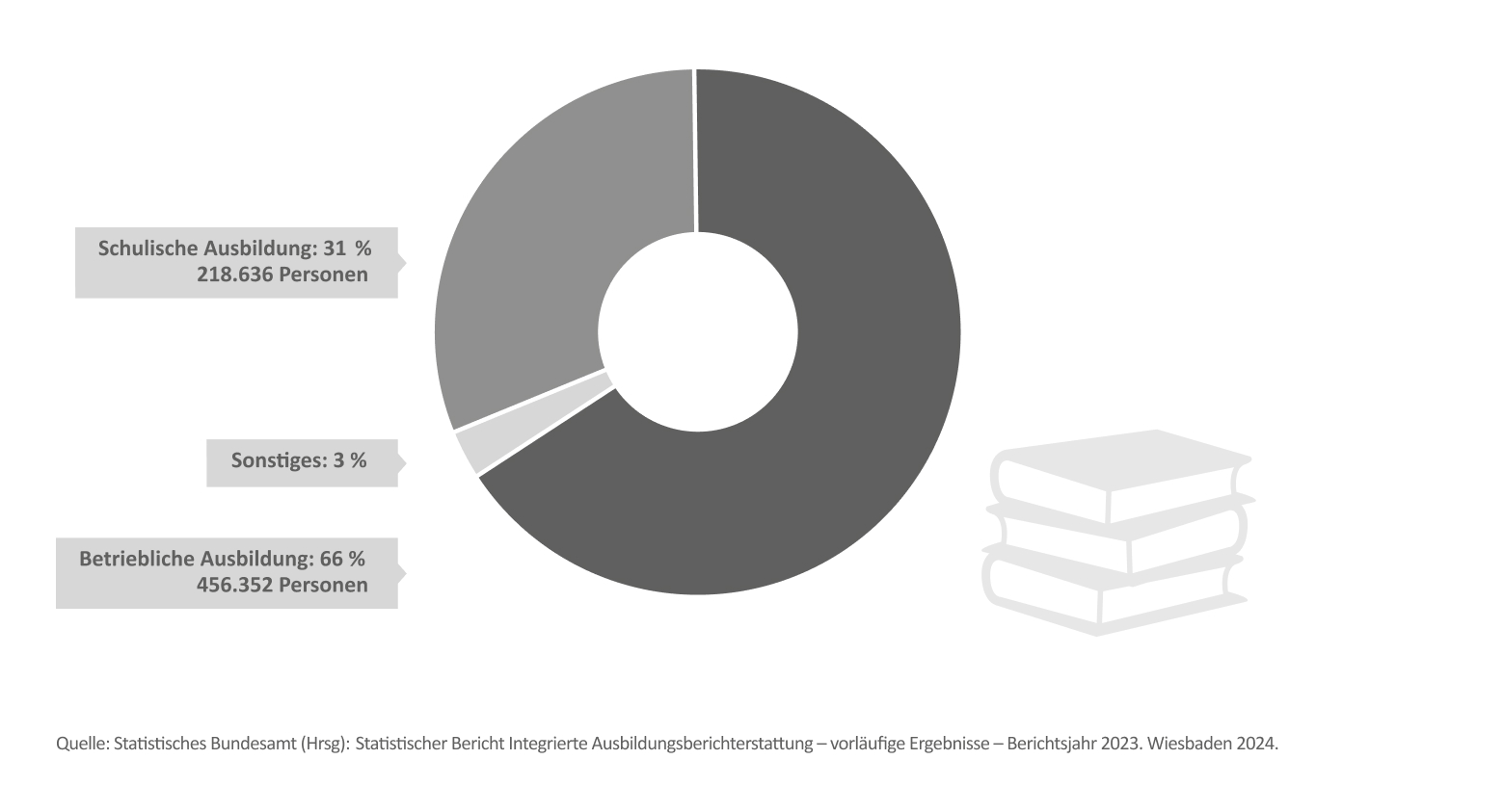 Im Jahr 2023 haben 694.505 Menschen eine Ausbildung begonnen. Mit 66 Prozent hat sich die große Mehrzahl für eine betriebliche Ausbildung entschieden. 31 Prozent der jungen Frauen und Männer haben eine schulische Ausbildung gewählt.1