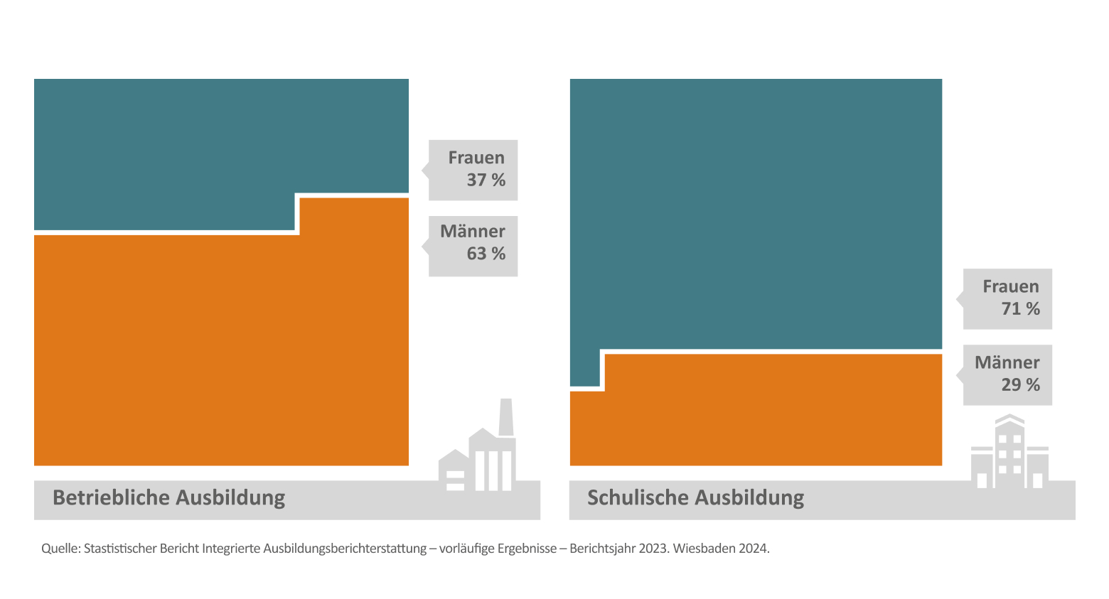 Darüber hinaus entscheiden sich Frauen häufiger für Berufe im Gesundheits-, Erziehungs- oder Sozialwesen, die hauptsächlich im Rahmen der schulischen Ausbildung gelehrt werden. Männer hingegen wählen häufiger handwerklich-technische Ausbildungsberufe, die in der betrieblichen Ausbildung einen hohen Stellenwert haben.3