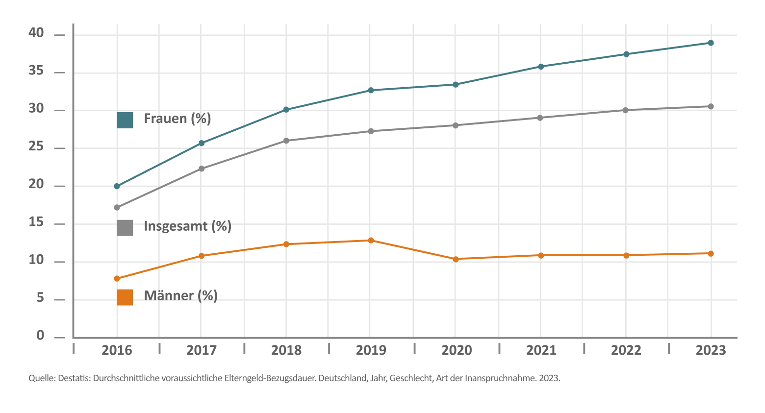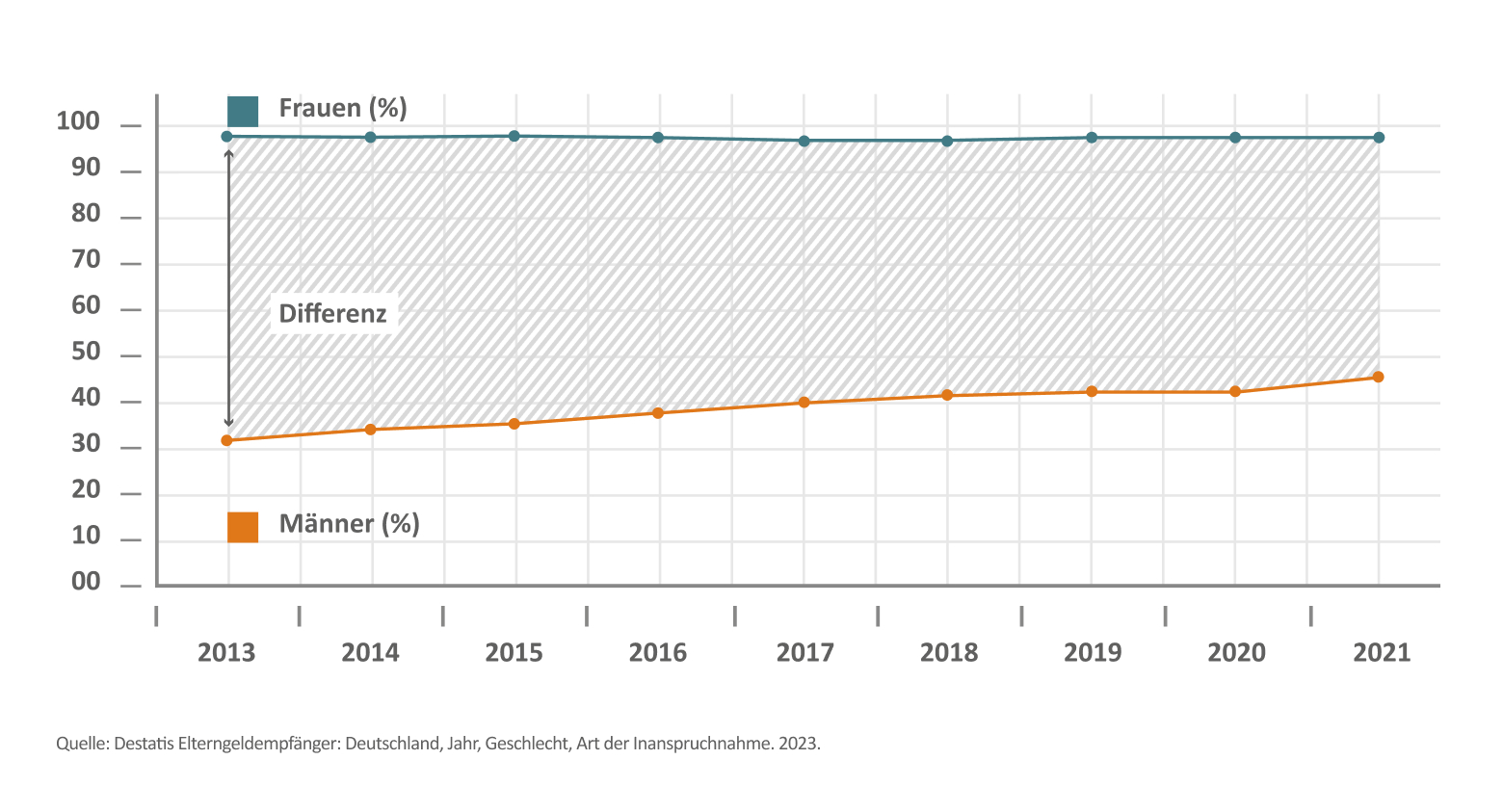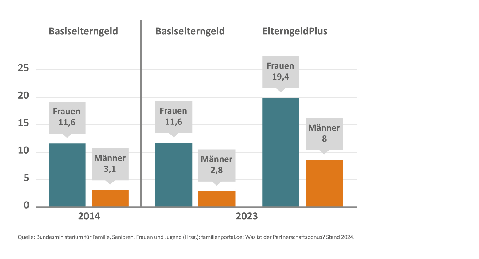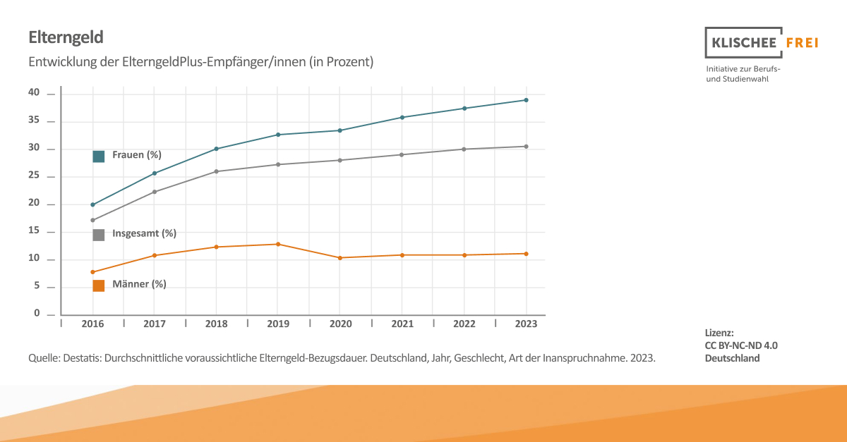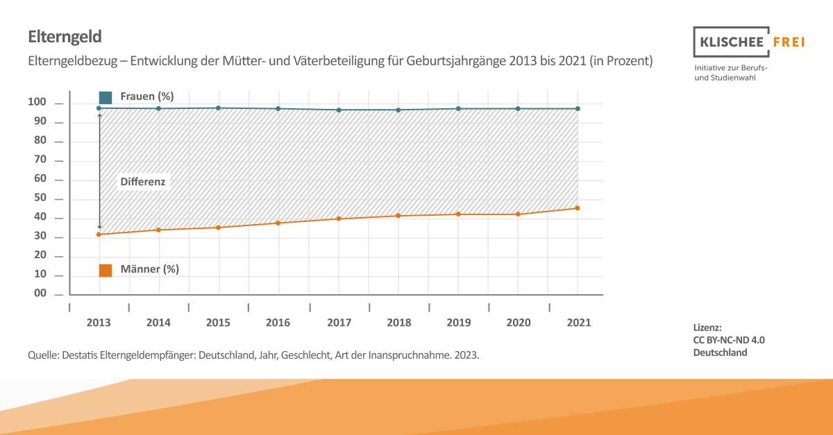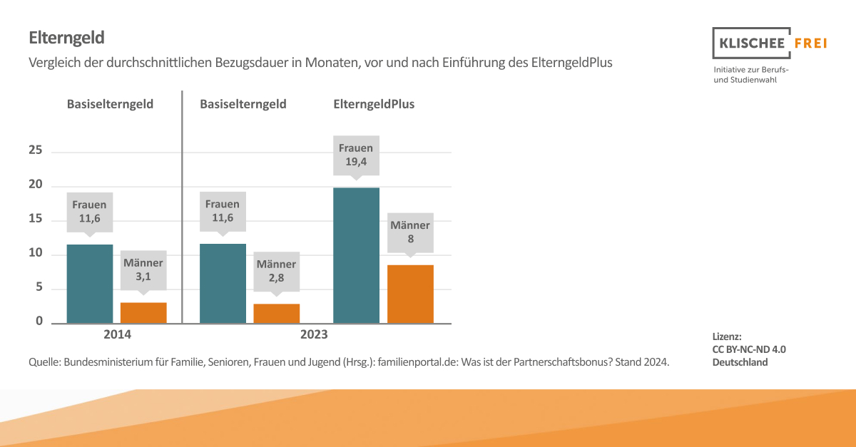 Dabei zeigen insbesondere die Varianten ElterngeldPlus und Partnerschaftsbonus den Weg zu mehr Partnerschaftlichkeit und Chancengleichheit auf: Studien zeigen, dass Väter in Elternzeit aktiver bei der Hausarbeit sind sowie mehr Zeit mit dem Kind verbringen – ein Effekt, der auch nach der Elternzeit bestehen bleibt.5