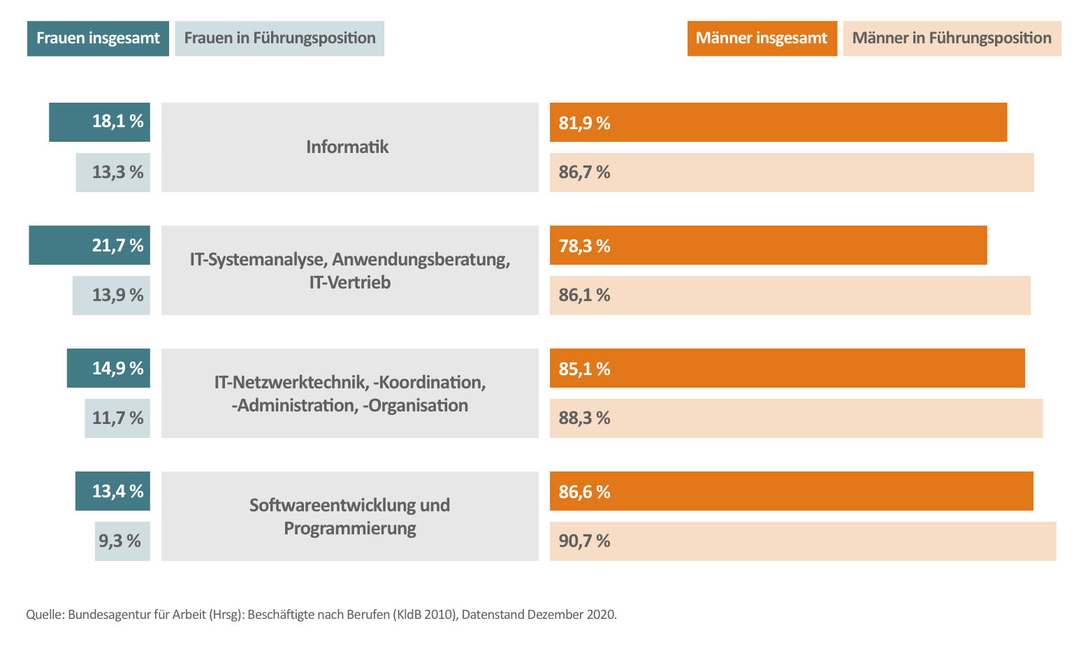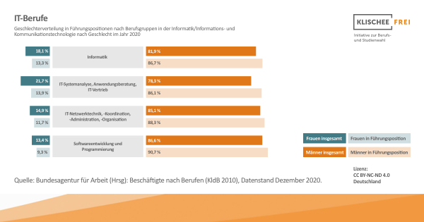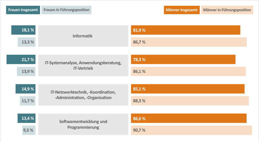 Bislang sind Frauen in IT-Berufen, genauer gesagt, in Berufen der Informatik, der IT-Systemanalyse, des IT-Vertriebs und vielen anderen Berufen rund um das Management von IT-Netzwerken sowie in der Softwareentwicklung und Programmierung stark unterrepräsentiert.
