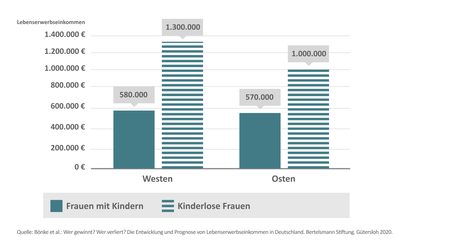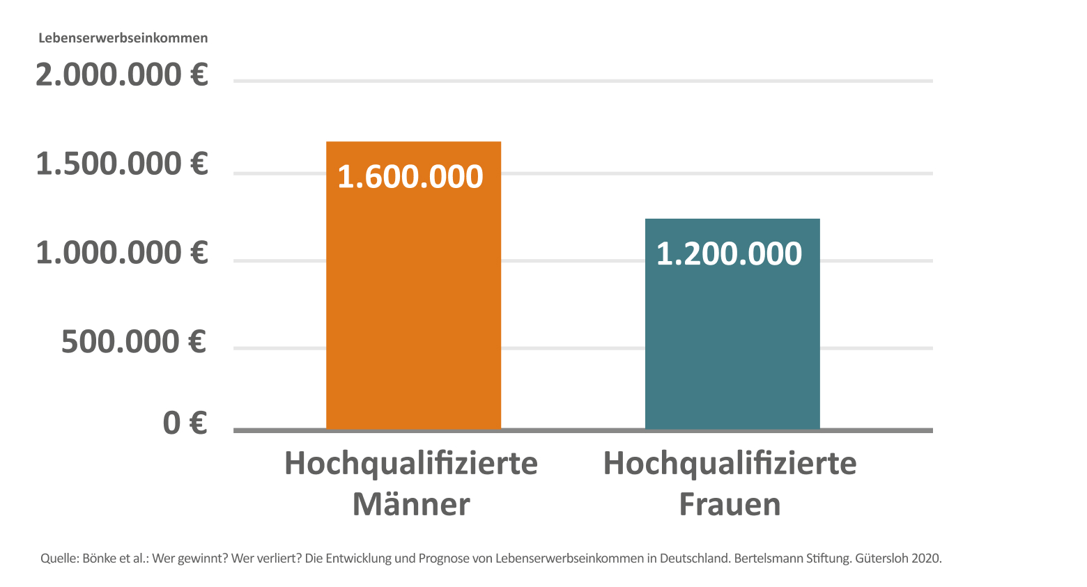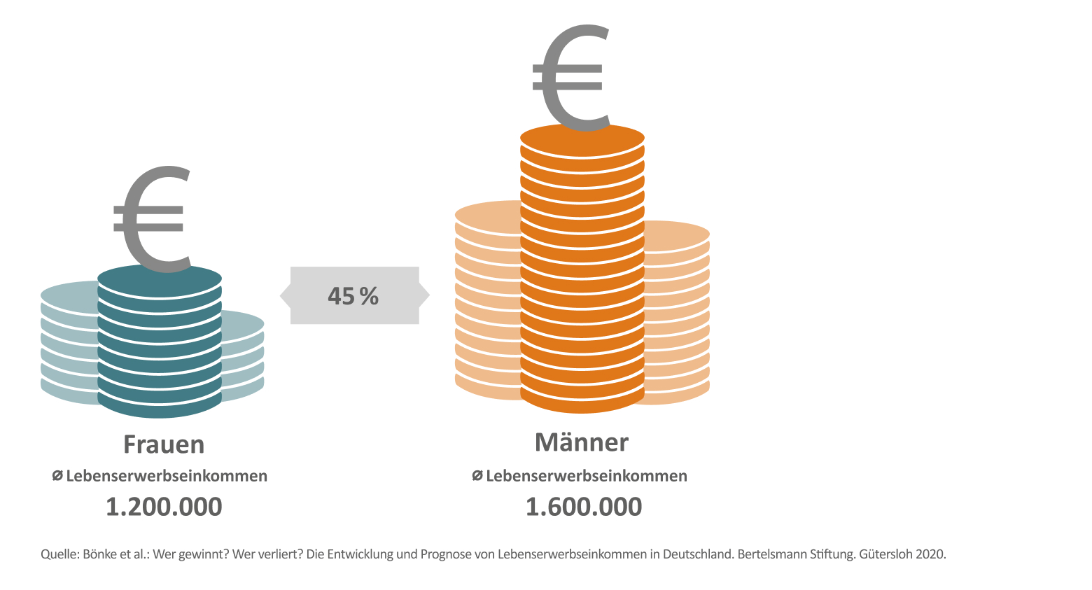 Betrachtet man das über das gesamte Erwerbsleben angesammelte Erwerbseinkommen, verdienen Frauen im Durchschnitt 45 Prozent weniger als Männer. Umgerechnet ergibt sich dadurch für Frauen in Westdeutschland ein Einkommensunterschied von 670.000 Euro und für Frauen in Ostdeutschland von 450.000 Euro.1