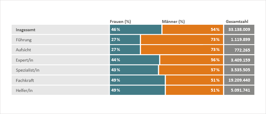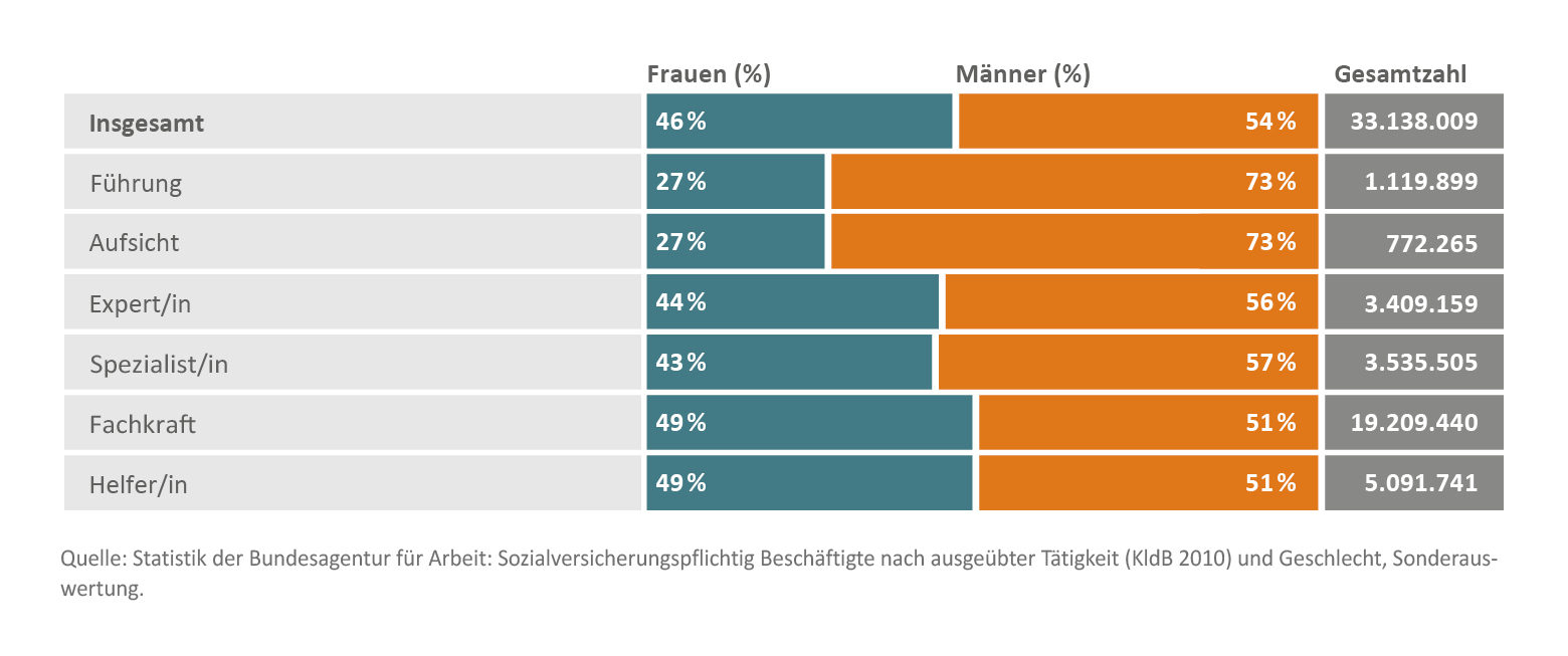 Die Ungleichheit der Geschlechter auf dem deutschen Arbeitsmarkt zeigt sich zum einen in der unterschiedlichen Verteilung von Frauen und Männern auf Berufe und Berufsbereiche (horizontale Segregation). Zum anderen sind Frauen und Männer auch ungleich auf verschiedenen beruflichen Hierarchieebenen vertreten (vertikale Segregation): Während der Frauenanteil an allen sozialversicherungspflichtig Beschäftigten insgesamt bei 46 Prozent liegt, sind Frauen nur zu jeweils 27 Prozent in einer Leitungsposition mit Führungs- oder Aufsichtsfunktion vertreten. Männer hingegen sind mit 73 Prozent deutlich stärker repräsentiert. Der Anteil der Spezialistinnen und Expertinnen liegt ebenfalls leicht unter dem Frauenanteil aller Beschäftigten. Am häufigsten sind Frauen auf dem Anforderungsniveau der Helfer/innen und Fachkräfte mit jeweils 49 Prozent zu finden. Hier ist das Geschlechterverhältnis insgesamt eher ausgeglichen. 1, 2