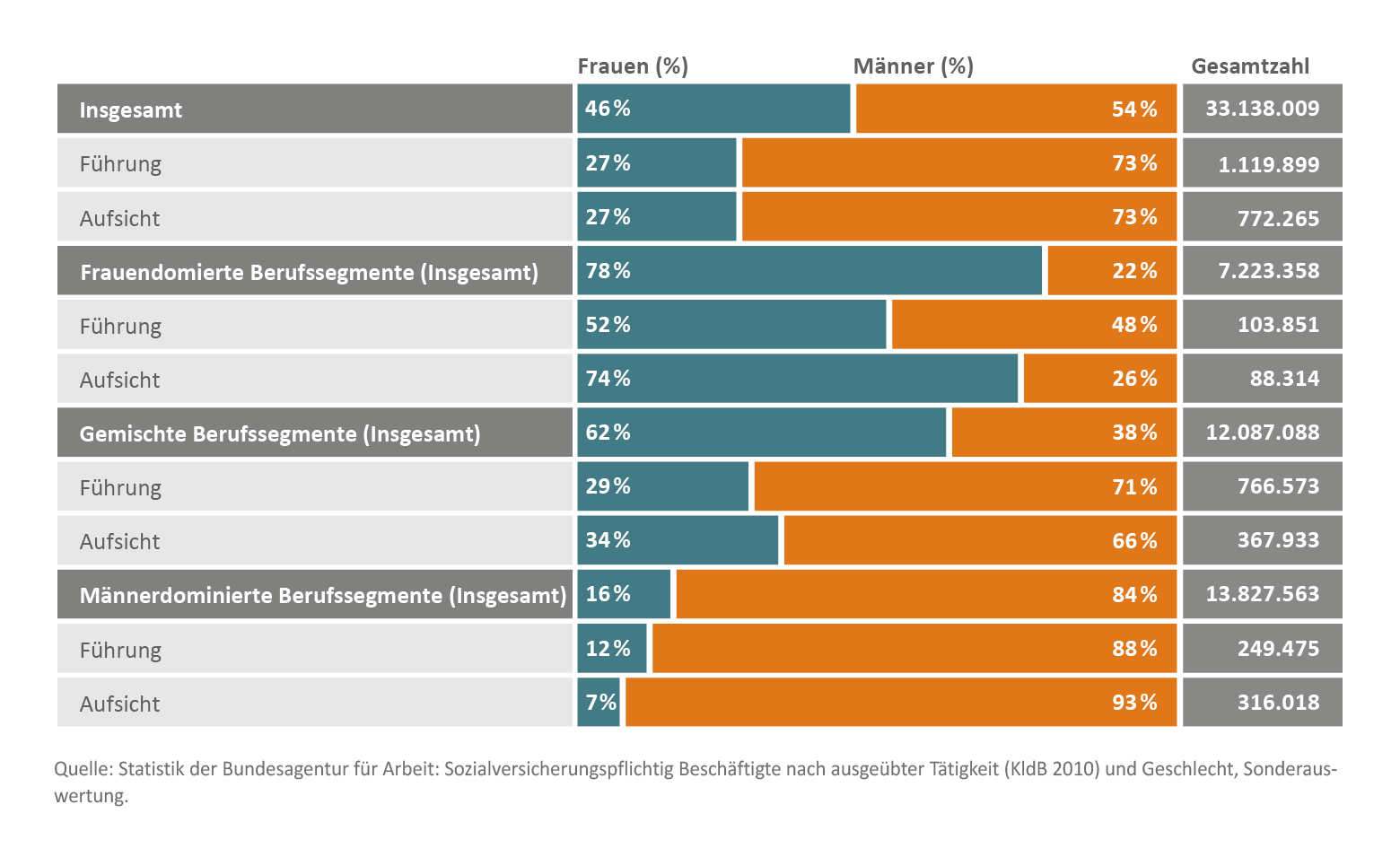 Betrachtet man verschiedene Berufssegmente, wäre anzunehmen, dass ein hoher Frauenanteil in einem Berufssegment auch mit einer hohen Anzahl von Frauen auf Leitungsebene einhergeht. Zwar sind Frauen in den Berufssegmenten mit hohem Frauenanteil (z. B. medizinische und nicht-medizinische Gesundheitsberufe, soziale und kulturelle Dienstleistungsberufe) am häufigsten in einer Führungsposition vertreten. Allerdings stellen sie hier nur 52 Prozent der Führungskräfte. Gemessen an ihrem Gesamtanteil von 78 Prozent sind sie damit deutlich unterrepräsentiert. Auch in den gemischten Berufssegmenten (z. B. Handelsberufe) sind Frauen mit 28 Prozent seltener auf der Führungsebene zu finden. Der Gesamtanteil der weiblichen Beschäftigten liegt in diesen Berufssegmenten bei 62 Prozent. Am niedrigsten ist der Frauenanteil mit 12 Prozent bei den Führungskräften in männerdominierten Berufssegmenten (z. B. Bau- und Ausbauberufe, Verkehrs- und Logistikberufe). In Aufsichtsfunktionen sind Frauen vor allem in frauendominierten Berufssegmenten, aber auch in gemischten Berufssegmenten häufiger vertreten.2