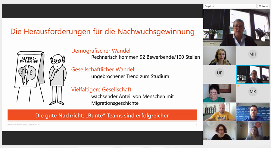 Die Referentinnen gingen in Ihrem Input vom Ausbildungsmarketing aus, denn die besonderen Regeln, die für das Gewinnen von Nachwuchskräften gelten, lassen sich gut so anwenden, dass auch die jeweils unterrepräsentierten Geschlechter angesprochen werden.