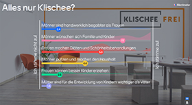 Das Methodenset „Klischeefrei macht Schule“ umfasst 12 interaktive Unterrichtsmethoden. Zusätzlich bietet es zwei Methoden für Eltern und Lehrende. Es gibt Erläuterungen zur Vorbereitung, Durchführung sowie Hinweise auf Vorschläge zur Reflexion, wie Klischees aufgegriffen werden können. Aus diesem Set stellte Christoph Kröger die Methode „Alles nur Klischee!“ vor: Per Mentimeter konnten sich die Teilnehmenden zu Fragen wie „Männer sind handwerklicher begabt als Frauen“, „Männer wünschen sich Familie und Kinder“, „Frauen machen Diäten“, „Männer putzen und machen den Haushalt“, „Frauen können besser Kinder erziehen“ sowie „Mütter sind wichtiger für die Erziehung“ beteiligen und anschließend austauschen.