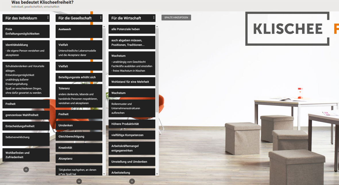 Diskutiert wurde kurz auch die Frage, was Klischeefreiheit für das Individuum, die Gesellschaft und die Wirtschaft bedeutet. Hier gab es eine rege Beteiligung der Teilnehmen mit dem Fazit, dass es bei Klischeefreiheit letztlich um eine Systemveränderung geht, von der alle Menschen profitieren, weil sie zum Vorteil aller ist. Für Jugendliche als Individuen kann Klischeefreiheit als eine Form der Aufklärung betrachtet werden: Wer bin ich? Was macht mich aus? Wie denke ich selbst von mir? Wie kann ich mich neu denken?