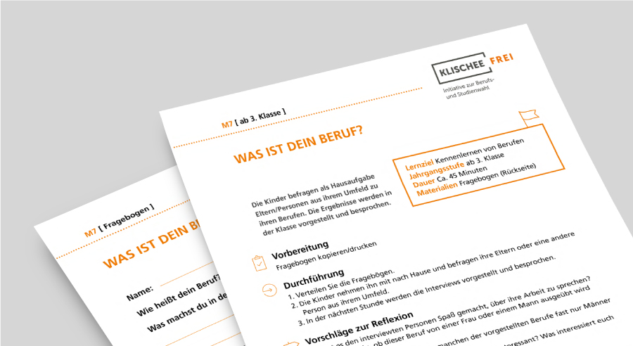 Eltern und Menschen aus dem eigenen Umfeld spielen für Berufsvorstellungen von Kindern eine entscheidende Rolle. Kinder ab der 3. Klasse können als Hausaufgabe Eltern und Personen aus ihrem Umfeld zu ihren Berufen befragen und die Ergebnisse in der Klasse vorstellen.