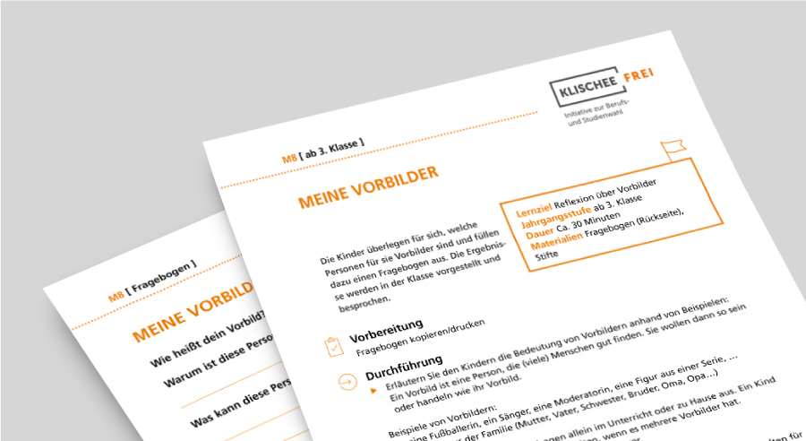 Welche (beruflichen) Vorbilder haben Kinder – und warum? Kinder ab der 3. Klasse überlegen, welche Personen für sie Vorbilder sind und füllen dazu einen Fragebogen aus. Die Ergebnisse werden in der Klasse vorgestellt und besprochen.