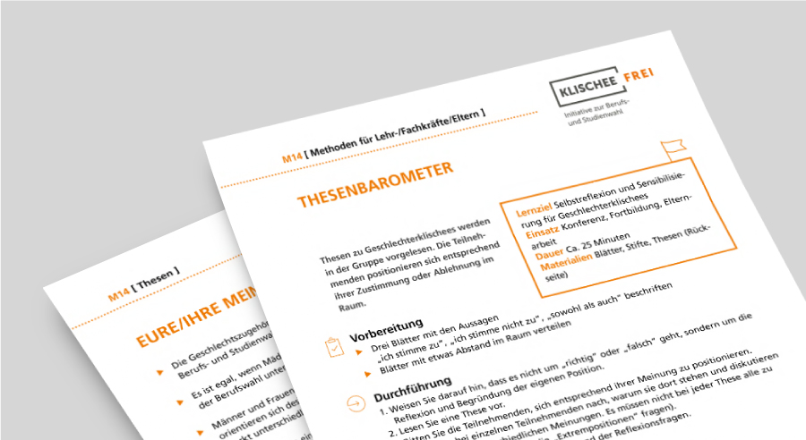 Das Thesenbarometer – analog zur Methode „M9 – Eure Meinung ist gefragt!“ – für Lehrkräfte, Fachkräfte sowie Eltern dient der Selbstreflexion in Bezug auf Geschlechterbilder und eignet sich für Konferenzen, Fortbildungen und die Elternarbeit in der Grundschule.