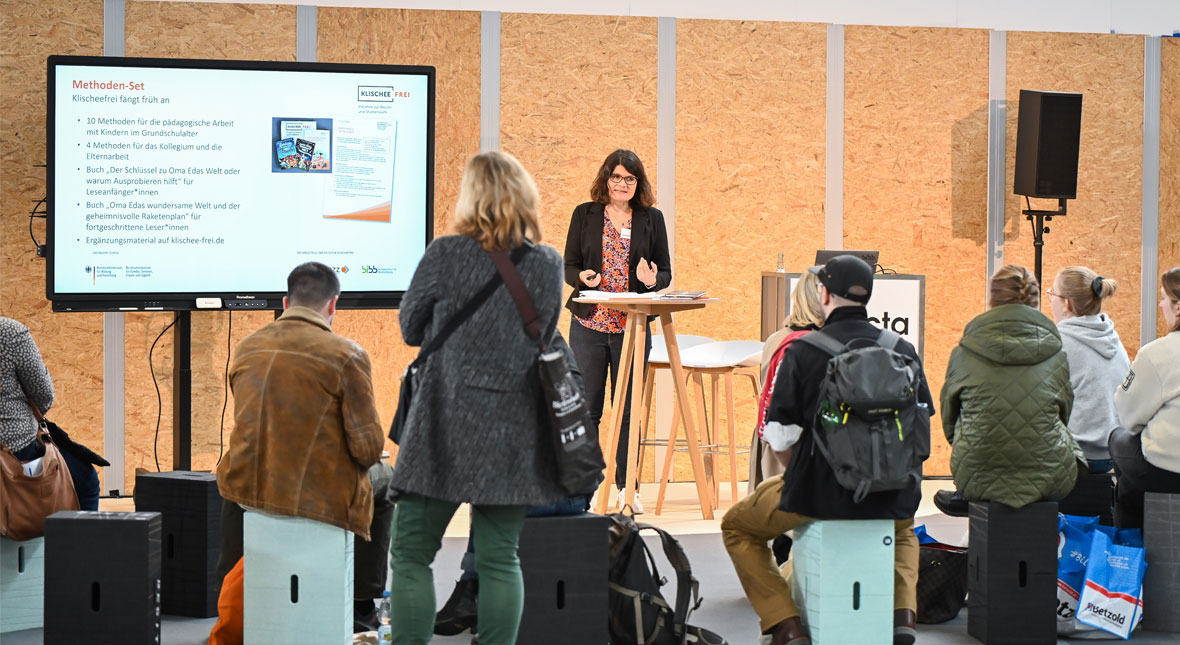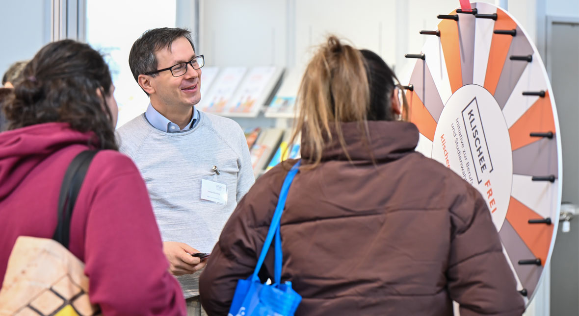 Neues, Bewährtes, aber vor allem Praxisorientiertes – ob am Wissensrad oder am gut sortierten Infotisch, das ist der Angebot der Initiative Klischeefrei auf der auf der didacta-Bildungsmesse 2023 in Stuttgart.