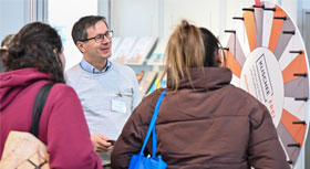 Auch der Klassiker Glücksrad regt zum Nachdenken über Fragen zu Beruf und Leben zu Geld, Familie und Freizeit an. Am Mittwoch, den 8. März, stellte Margit von Kuhlmann von der Initiative Klischeefrei, alle Angebote für Lehrkräfte in der Speakers' Area vor.