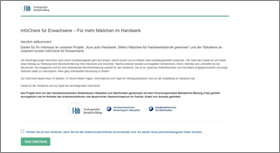 Für die Berufsorientierung sind erwachsene Bezugspersonen meist die erste Informationsquelle von Jugendlichen. Hier setzt der InfoCheck an, der sich an an Eltern und Lehrkräfte richtet. Durch niedrigschwellige Fragen zum Thema „Frauen im Handwerk“ liefert er Informationen zu handwerklichen Berufen.