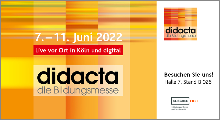 Die Initiative Klischeefrei präsentiert sich auf der didacta 2022. Beratung und Informationen rund um die gendersensible Berufs- & Studienwahl gibt es vom 7.–11. Juni in Halle 7, Stand B 026. Besucherinnen und Besucher erwartet eine Quiz- und Vorlese-Aktion sowie Vorträge zu Angeboten & Materialien.