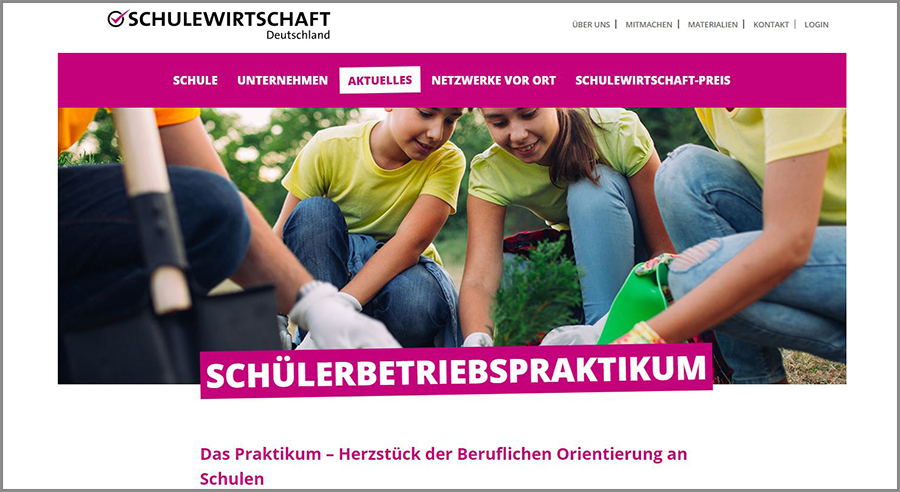 SCHULEWIRTSCHAFT hat eine neue Landingpage zum Thema Schülerbetriebspraktikum aufgelegt. Dort finden Unternehmensvertreterinnen und -vertreter, Schülerinnen und Schüler sowie Multiplikatorinnen und Multiplikatoren Infos, Tipps und Tricks.
