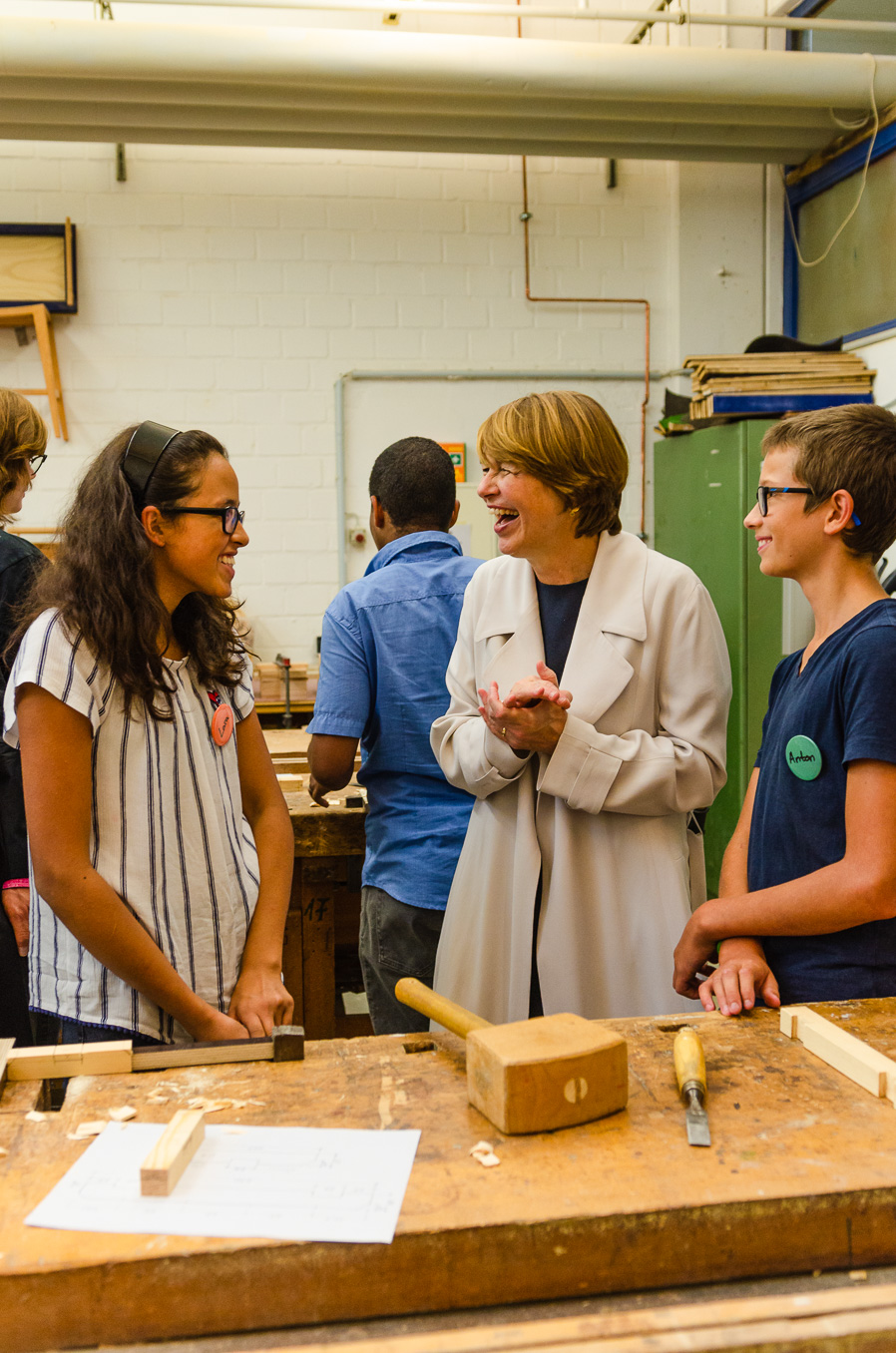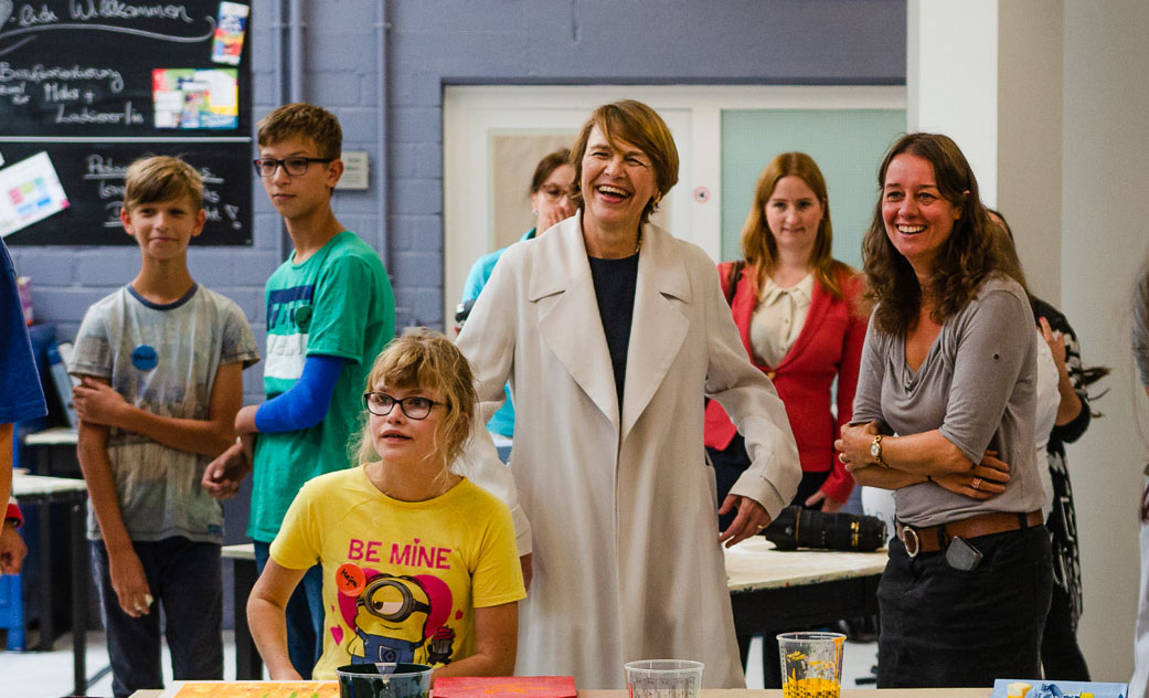 Elke Büdenbender besuchte das Berufsbildungszentrum in ihrer Funktion als Schirmherrin der Initiative Klischeefrei. Sie zeigte sich vom Engagement der Einrichtung beeindruckt. Dort finden neben schulischen, ebenso unterschiedlichste berufspraktische Vorbereitungskurse statt. In drei Werkstattbereichen demonstrierten Schülerinnen und Schüler der Förderschule LVR-Irena-Sendler-Schule des Landschaftsverbandes Rheinland Elke Büdenbender, wie zum Beispiel ein gemeinsamer, inklusiver Praxistag im Friseur-, Maler- und Tischlerei-Handwerk abläuft.