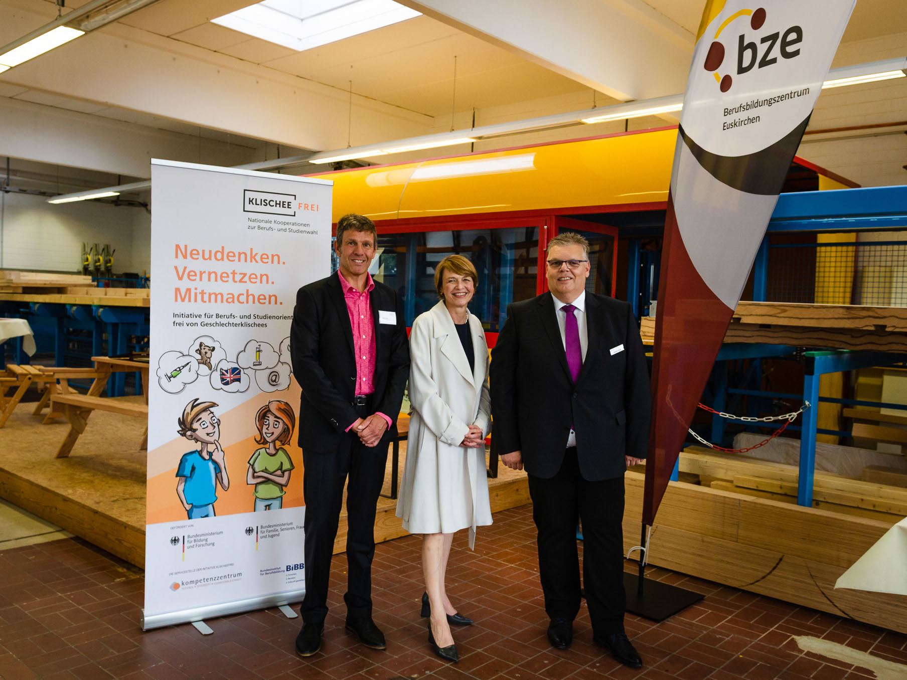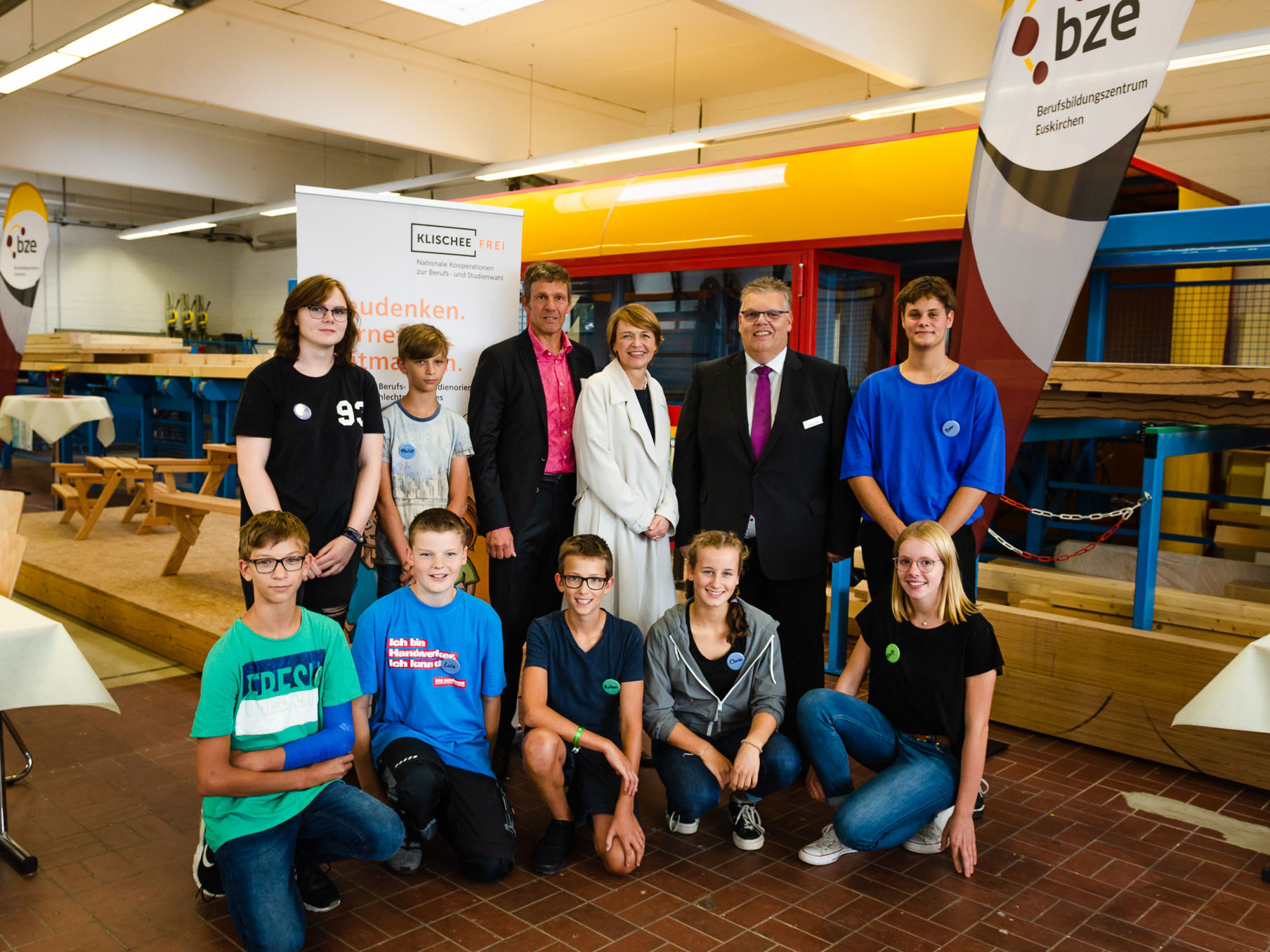 Elke Büdenbender, Schirmherrin der Initiative Klischeefrei, besuchte das Berufsbildungszentrum Euskirchen (BZE). Sie informierte sich über das breite Angebot der Einrichtung, besichtigte Werkstätten und diskutierte mit Schülerinnen und Schülern über ihre Berufswünsche. Das BZE ist Partner der bundesweiten Initiative Klischeefrei, deren Ziel es ist, das Spektrum der Berufswahl junger Menschen über Geschlechtergrenzen hinaus zu erweitern.