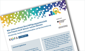 Das Projekt KOFA (Kompetenzzentrum Fachkräftesicherung) am Institut der deutschen Wirtschaft wird durch das Bundesministerium für Wirtschaft und Energie (BMWi) gefördert. Der Fokus des Projektes liegt in der Unterstützung von kleinen und mittleren Unternehmen (KMU) bei der Fachkräftesicherung und der Gestaltung ihrer Personalarbeit. Das KOFA bietet auf seiner Homepage konkrete Handlungsempfehlungen, wie Unternehmen Beschäftigungspotenziale von Frauen besser noch besser nutzen können.
