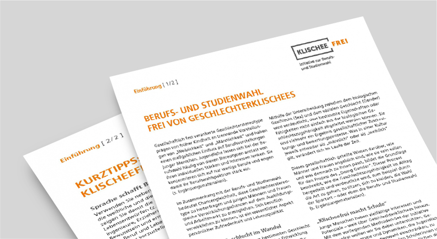 Die Handreichung der Hans-Böckler-Stiftung „Gendersensible Berufsorientierung – Informationen und Anregungen“ von Prof. Hannelore Faulstich-Wieland und Barbara Scholand (et al.) enthält empirisch-theoretische Hintergründe über die Zusammenhänge von Berufswahlprozessen und Geschlecht sowie konkrete Anregungen für den Unterricht. Die Handreichung ist sowohl für den Fachunterricht, als auch für den Berufsorientierungsunterricht geeignet und richtet sich an Lehrkräfte, Berufsberatende sowie Multiplikatorinnen und Multiplikatoren.