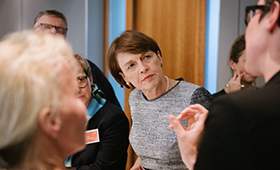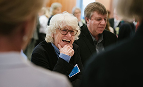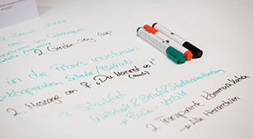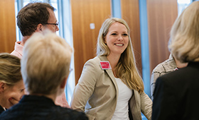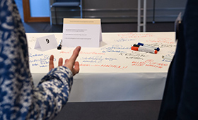 Beim World Café trafen sich die Teilnehmenden in 16 Gruppen, um über insgesamt sieben Themen rund um klischeefreie Berufswahl zu diskutieren. Schirmherrin Elke Büdenbender und Juliane Seifert, Staatssekretärin im Bundesjugendministerium, nahmen als Gastgeberinnen an zwei Tischen teil. Die Thementische orientierten sich an den Zielgruppen der Initiative Klischeefrei: Einrichtungen der Frühen Bildung, Schulen, Hochschulen, Unternehmen, Berufsberatung und Eltern. An Elke Büdenbenders Tisch diskutierten die Teilnehmenden über eine „Zukunftsversion Klischeefrei“. Juliane Seifert übernahm das Thema „Frühe Bildung“. Die Ergebnisse der Gruppendiskussion finden sich im Download-Dokument.