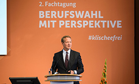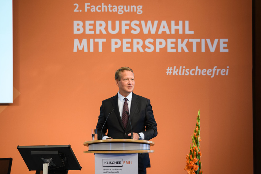 Dr. Eric Schweitzer regte in seiner Begrüßungsansprache eine schon frühe berufliche Orientierung ohne Rollenklischees an. Man könne nicht früh genug damit beginnen, Klischees aufzubrechen. Ziel der Industrie- und Handelskammern sei es, angesichts des in einigen Berufen schon jetzt starken Mangels, Fachkräfte zu gewinnen und zu halten, unabhängig vom Geschlecht. Dafür seien neben der frühen Bildung auch frühe Berührungspunkte mit dem Arbeitsleben notwendig, zum Beispiel in Form von Praktika oder beim Girls'Day und Boys'Day.