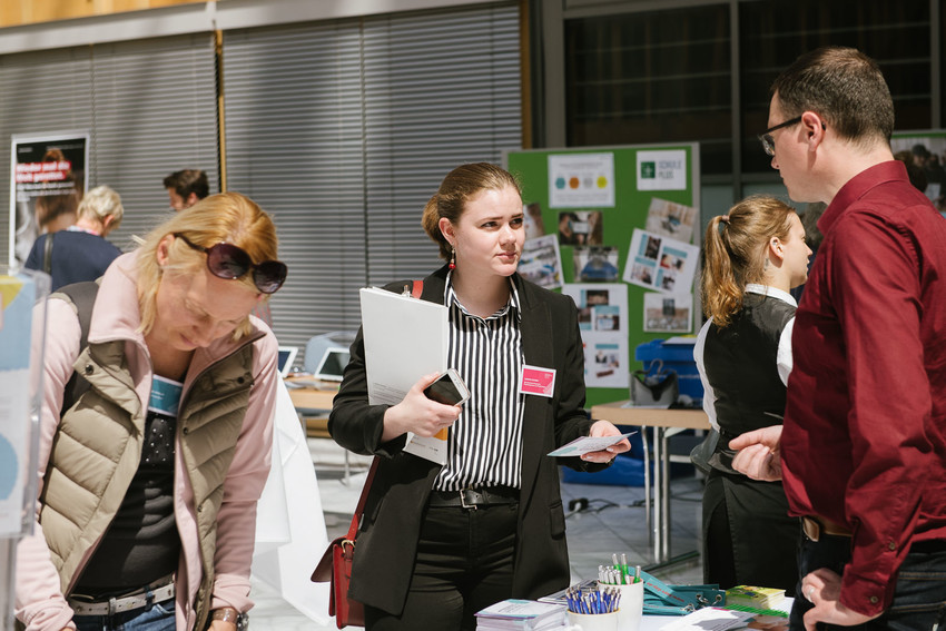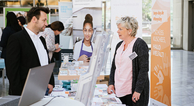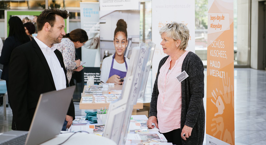 Der Klischeefrei-Markt begleitete die Fachtagung. Partnerorganisationen der Initiative stellten sich und ihre Arbeit vor und informierten über ihr jeweiliges Engagement im weiten Feld der klischeefreien Berufsorientierung. Die Ausstellerinnen und Aussteller kamen aus ganz unterschiedlichen Bereichen.