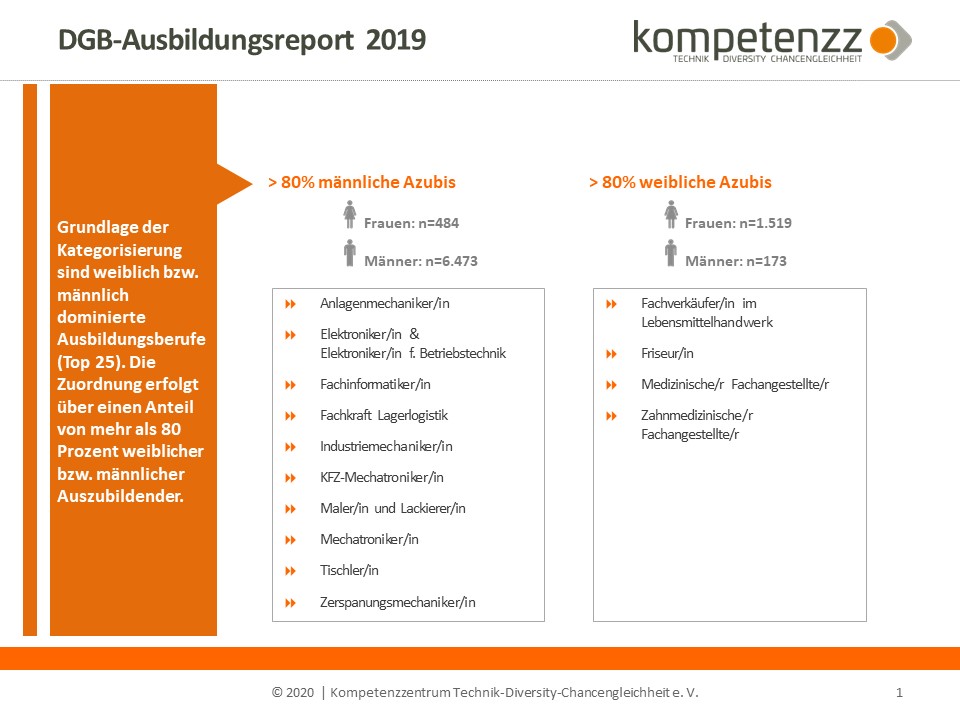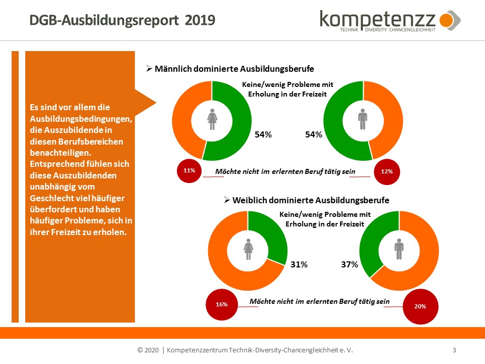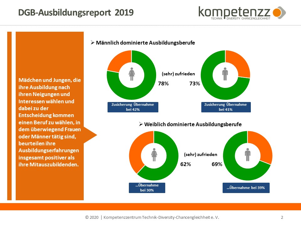 Eine Sonderauswertung des Ausbildungsreports 2019 des Deutschen Gewerkschaftsbundes für das Kompetenzzentrum Technik-Diversity-Chancengleichheit e. V. zeigt, dass junge Männer, die sich für eine Ausbildung in weiblich dominierten Berufen entscheiden, diese im Vergleich zu ihren weiblichen Mitauszubildenden positiver bewerten. Auch die jungen Frauen in männlich dominierten Ausbildungsberufen kommen überdurchschnittlich gut zurecht. Aber die Ergebnisse zeigen auch: Auszubildende in weiblich dominierten Ausbildungsberufen sind gegenüber den Auszubildenden in männlich dominierten Ausbildungsberufen strukturell schlechter gestellt.