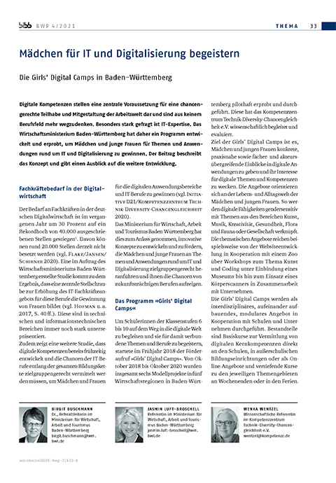 Um Schülerinnen auf dem Weg in die digitale Welt zu begleiten und sie für alle damit verbundenen Themen und zukunftsweisenden Berufe zu begeistern, werden von Oktober 2018 bis Oktober 2020 Girls' Digital Camps in den Wirtschaftsregionen Rhein-Neckar, Ostwürttemberg, Stuttgart und Esslingen, Südlicher Oberrhein/Ortenau und Mittlerer Oberrhein/Karlsruhe pilothaft erprobt.