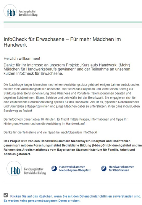 Der InfoCheck ist kostenfrei zugänglich. Er wurde im Projekt „Kurs aufs Handwerk: (Mehr) Mädchen für Handwerksberufe gewinnen“ entwickelt. Dabei werden jungen Frauen die vielfältigen Möglichkeiten einer Berufswahl im Handwerk aufgezeigt. In Zusammenarbeit mit den Talentscoutinnen der Handwerkskammern Niederbayern-Oberpfalz und Oberfranken werden Informationen zum Thema Ausbildung im Handwerk und genderneutrale entdeckende Berufsorientierung vor Ort angeboten. Dabei unterstützen und beraten die Talentscoutinnen im Sinne eines ganzheitlichen Ansatzes nicht nur Schülerinnen und Schüler, sondern auch Eltern, Lehrkräfte und Betriebe.