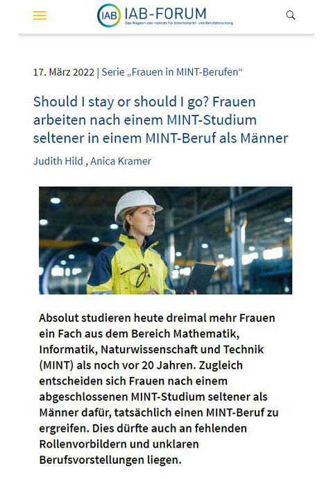 Absolut studieren heute dreimal mehr Frauen ein Fach aus dem Bereich Mathematik, Informatik, Naturwissenschaft und Technik (MINT) als noch vor 20 Jahren. Zugleich entscheiden sich Frauen nach einem abgeschlossenen MINT-Studium seltener als Männer dafür, tatsächlich einen MINT-Beruf zu ergreifen. Der Beitrag erörtert die Gründe.