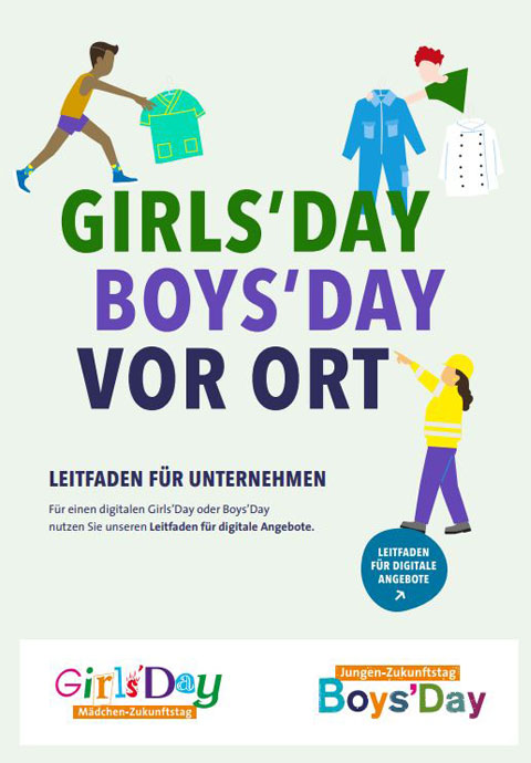 In diesem Leitfaden für Unternehmen und Institutionen finden Sie Tipps für einen erfolgreichen Girls'Day und Boys'Day vor Ort. Er enthält Beispiele, Ideen und Checklisten, damit Sie einen interessanten und erfolgreichen Aktionstag vor Ort gestaltet können.